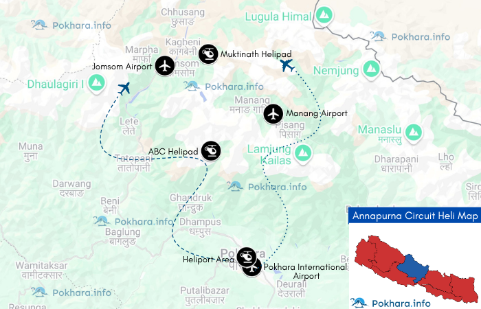 Most operators handle their departures out of Pokhara and Kathmandu. It is mostly for the longer charter flights. The landing sites commonly used are Annapurna Base Camp, Tilicho Lake, High Camp, Muktinath and designated high-altitude grounds near Manang or Chame. However, exact landing decisions are weather, load and safety dependent. Flight plans and permits are normally arranged by your operator.