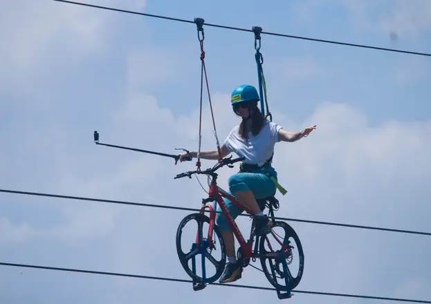 Skycycling goes on near Sarangkot in Pokhara. A high-wire cycle hangs above the hillside there. Riders pedal while suspe...